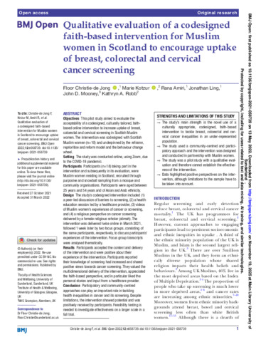 Christie-De Jong, Floor, Kotzur, Marie, Amiri, Rana, Ling, Jonathan, Mooney, John and Robb, Katie (2022) A qualitative evaluation of a co-designed faith-based intervention for Muslim women in Scotland to encourage uptake of breast, colorectal and cervical cancer screening. BMJ Open, 12 (e05873). ISSN 2044-6055