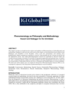 Hayes, Catherine (2022) Phenomenology as Philosophy and Methodology: Husserl and Heidegger for the Uninitiated. In: Phenomenological Studies in Education. IGI Global, Pennsylvania, USA. (In Press)