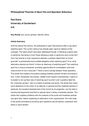 Davis, Paul (2022) Philosophical Theories of Sport Fan and Spectator Behaviour. In: Routledge Resources Online - Sport Studies. Routledge Resources Online . Routledge, London.