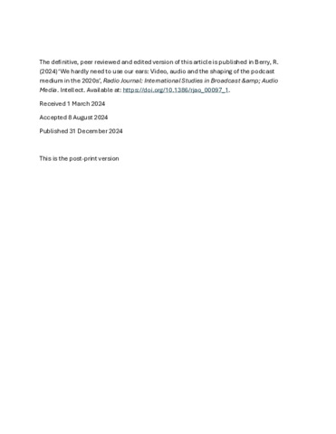 Berry, Richard (2024) We hardly need to use our ears: Video, audio and the shaping of the podcast medium in the 2020s. Radio Journal: International Studies in Broadcast & Audio Media, 22 (2). pp. 145-162. ISSN 1476-4504