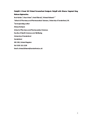 Karkar, Yasir, Amer, Ihsan, Elkordy, Amal and Faheem, Ahmed (2025) Flexipill: A novel 3D printed personalised analgesic polypill with diverse targeted drug release approaches. Journal of drug delivery science and technology, 108 (106882). ISSN 1773-2247