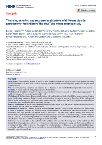 Fraser, Lorna, Bedendo, Andre, O'Neill, Mark, Taylor, Johanna, Hackett, Julia, Horridge, Karen, Cade, Janet, Richardson, Gerry, Phung, Thai Han, Beresford, Bryony, McCarter, Alison and Hewitt, Catherine (2025) The risks, benefits, and resource implications of different diets in gastrostomy-fed children: The YourTube mixed method study. Health technology assessment (Winchester, England), 29 (25). pp. 1-21. ISSN 2046-4924