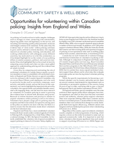 O'Connor, Chris and Pepper, Ian (2024) Opportunities for volunteering within Canadian policing: Insights from England and Wales. Journal of Community Safety and Well-Being, 9 (3). pp. 116-118. ISSN 2371-4298