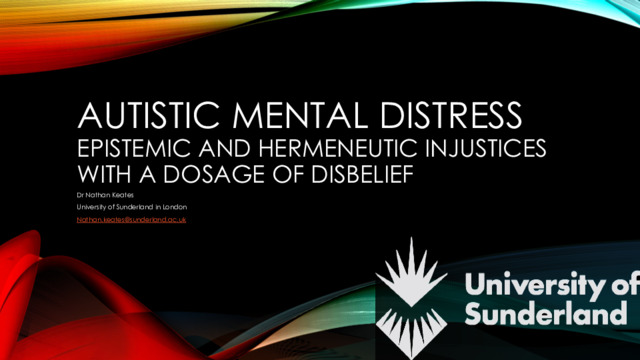 Keates, Nathan (2025) Autistic Mental Distress: epistemic and hermeneutic injustices with a dosage of disbelief. In: BSA's Symposium: Advances in the Sociology of Mental Health, 18-19 September 2025, University of York, York (UK). (Unpublished)