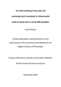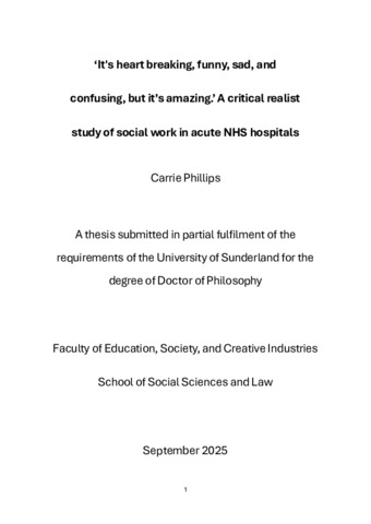 Phillips, Carrie (2025) ‘It's heart breaking, funny, sad, and confusing, but it’s amazing.’ A critical realist study of social work in acute NHS hospitals. Doctoral thesis, The University of Sunderland.