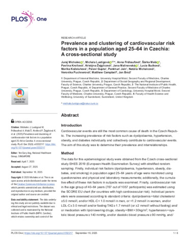 Michalec, Juraj, Lustigová, Michala, Frűhaufová, Anna, Malá, Šárka, Krollová, Pavlína, Žejglicová, Kristýna, Malinovská, Jana, Bučková, Lucia, Koželuhová, Marika, Gupta, Palavi, Jain, Pankhuri, Michalcová, Natália, Puchnerová, Veronika, Campbell, Matthew and Brož, Jan (2025) Prevalence and clustering of cardiovascular risk factors in a population aged 25–64 in Czechia: A cross-sectional study. PLOS One, 20 (9): e0332217. e0332217. ISSN 1932-6203