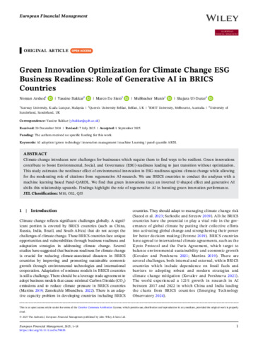 Arshed, Noman, Bakkar, Yassine, De Sisto, Marco, Munir, Mubbasher and Ul‐Durar, Shajara (2025) Green Innovation Optimization for Climate Change ESG Business Readiness: Role of Generative AI in BRICS Countries. European Financial Management. ISSN 1468-036X