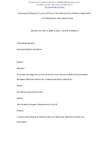 Miller, Bethaney, McCreary, David and Rees, Jon (2025) How accurate is point-of-care ultrasound for detecting paediatric appendicitis? A systematic review and meta-analysis. Archives of Disease in Childhood: archdischi. archdischild-2025. ISSN 1468-2044