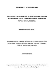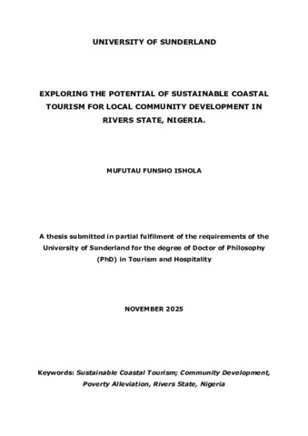 Ishola, Mufutau Funsho (2025) EXPLORING THE POTENTIAL OF SUSTAINABLE COASTAL TOURISM FOR LOCAL COMMUNITY DEVELOPMENT IN RIVERS STATE, NIGERIA. Doctoral thesis, The University of Sunderland.