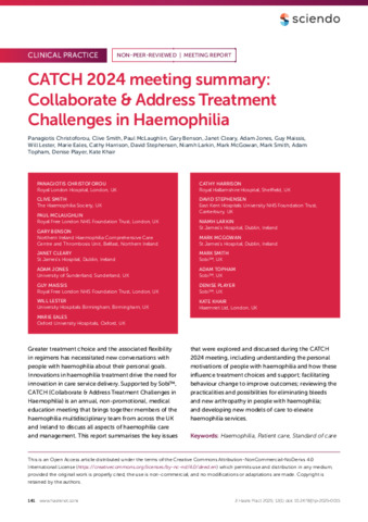 Christoforou, Panagiotis, Smith, Clive, McLaughlin, Paul, Benson, Gary, Cleary, Janet, Jones, Adam, Maissis, Guy, Lester, Will, Eales, Marie, Harrison, Cathy, Stephensen, David, Larkin, Niamh, McGowan, Mark, Smith, Mark, Topham, Adam, Player, Denise and Khair, Kate (2025) CATCH 2024 meeting summary: Collaborate & Address Treatment Challenges in Haemophilia. The Journal of Haemophilia Practice, 12 (1). pp. 141-149. ISSN 2055-3390
