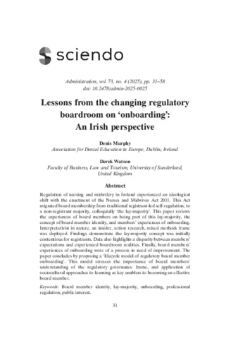 Murphy, Denis and Watson, Derek (2025) Lessons from the changing regulatory boardroom on ‘onboarding’: An Irish Perspective. Journal of the Institute of Public Administration of Ireland, 73 (4). pp. 31-58. ISSN 0001-8325