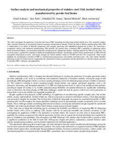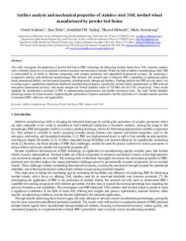 Ashkani, Omid, Rezayat, Mohammad, Fathi, Sina, Sadeq, Abdellatif M., AHMAD MEHRABI, HAMID and Armstrong, Mark (2025) Surface analysis and mechanical properties of stainless steel 316L toothed wheel manufactured by powder bed fusion. The International Journal of Advanced Manufacturing Technology, 137. pp. 2889-2898.