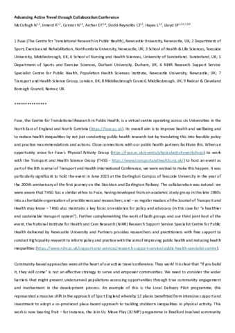 McCullogh, N, Innerd, A, Connor, N, Archer, David, Dodd-Reynolds, C, Hayes, L and Lloyd, SP (2025) Advancing active travel through collaboration conference. Journal of Transport & Health, 44 (S). pp. 1-2. ISSN 2214-1405