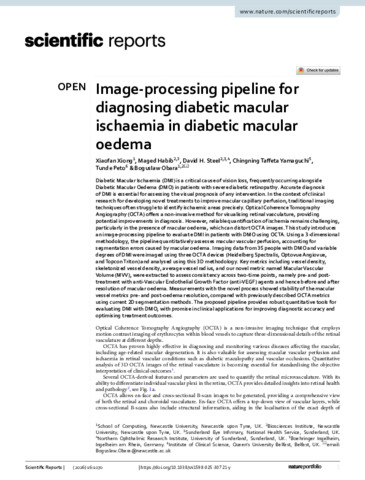 Xiong, Xiaofan, Habib, Maged, Steel, David H., Yamaguchi, Chingning Taffeta, Peto, Tunde and Obara, Boguslaw (2025) Image-processing pipeline for diagnosing diabetic macular ischaemia in diabetic macular oedema. Scientific reports, 16 (1070). ISSN 2045-2322