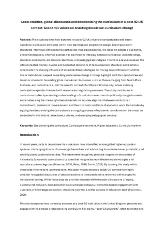 Local realities, global discourses and decolonising the curriculum in a post-92 UK context - Academic voices on enacting decolonial curriculum change.pdf - Accepted Version Available under License Creative Commons Attribution. Download (422kB) | Preview |