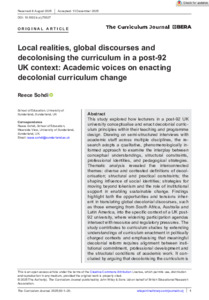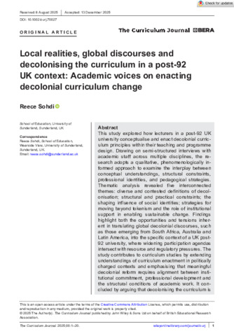 The Curriculum Journal - 2025 - Sohdi - Local realities global discourses and decolonising the curriculum in a post‐92 UK.pdf - Published Version Available under License Creative Commons Attribution. Download (487kB) | Preview |
