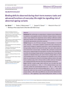 Butler, Joe, Watermeyer, Tamlyn J, Danso, Samuel O. and Parra, Mario A A (2025) Binding deficits observed during short‐term memory tasks and advanced functions of everyday life might be signalling risk of abnormal ageing variants. Alzheimer's & Dementia, 21 (S3): e105081. e105081. ISSN 1552-5279