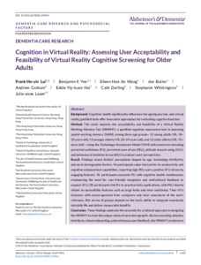 Lai, Frank Ho‐yin, Yee, Benjamin K, Wang, Eileen Han‐Jie, Butler, Joe, Graham, Andrew, Hai, Eddie Yip‐kuen, Darling, Cath, Whittington, Stephanie and Lowe, Julie‐anne (2025) Cognition in Virtual Reality: Assessing User Acceptability and Feasibility of Virtual Reality Cognitive Screening for Older Adults. Alzheimer's & dementia : the journal of the Alzheimer's Association, 21 (Suppl). ISSN 1552-5279