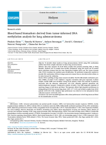 This study analyzed 56 LUAD blood samples from patients attending clinic at Siriraj Hospital, Thailand and 51 samples from healthy participants, using 644 tumor and 59 normal tissue methylome datasets from the Gene Expression Omnibus (GEO) and The Cancer Genome Atlas (TCGA) databases for candidate gene identification. We performed comparative analysis to identify DNA methylation (DNAm) changes present in tumors that are also observable in blood, to be taken forward for validation.