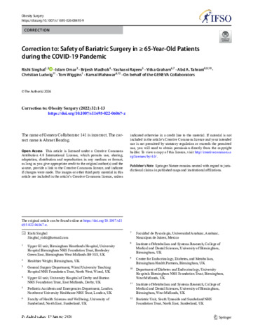 Singhal, Rishi, Omar, Islam, Madhok, Brijesh, Rajeev, Yashasvi, Graham, Yitka, Tahrani, Abd A, Ludwig, Christian, Wiggins, Tom and Mahawar, Kamal (2026) Correction to: Safety of Bariatric Surgery in ≥ 65-Year-Old Patients during the COVID-19 Pandemic. Springer.