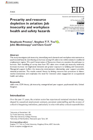 Preston, Stephanie Anne, Teo, Stephen, Blenkinsopp, John and Cook, Clare (2026) Precarity and Resource Depletion in Aviation: Job Insecurity and Workplace Health and Safety Hazards. Economic and Industrial Democracy. ISSN 0143-831X