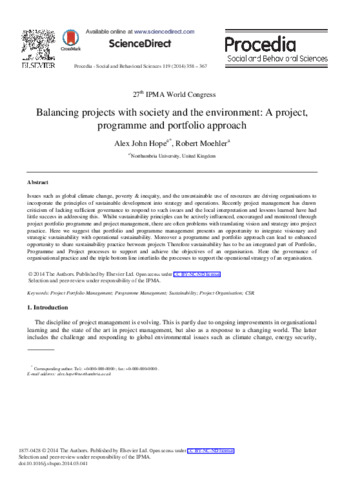 Hope, Alex John and Moehler, Robert (2014) Balancing Projects with Society and the Environment: A Project, Programme and Portfolio Approach. Procedia - Social and Behavioral Sciences, 119. pp. 358-367. ISSN 18770428