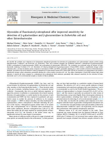 Burton, Michael, Cains, Chris, Fenwick, Danielle J C, Foster, Amy, Preece, Clair L., Saleem, Sidrah, Stanforth, Stephen P., Turner, Hayley J, Turnbull, Graeme and Perry, John D. (2026) Glycosides of fluorinated p-nitrophenol offer improved sensitivity for detection of β-galactosidase and β-glucuronidase in Escherichia coli and other Enterobacterales. Bioorganic & Medicinal Chemistry Letters, 135 (130573). ISSN 0960-894X