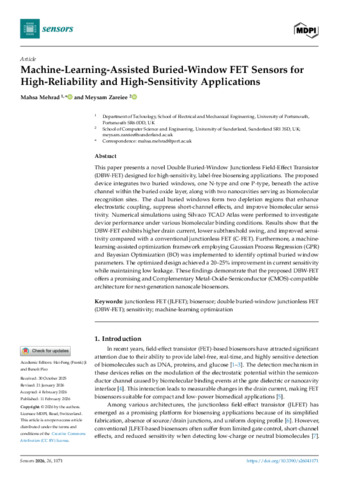 Mehrad, Mahsa and Zareiee, Meysam (2026) Machine-Learning-Assisted Buried-Window FET Sensors for High-Reliability and High-Sensitivity Applications. Sensors, 26 (4). p. 1171. ISSN 1424-8220