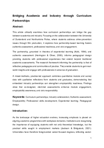 This article critically examines how curriculum partnerships can bridge the gap between academia and industry. Focusing on the collaboration between the University of Sunderland and Northumbria Police, where students address crime-prevention issues through film production, it explores how partnership-based learning fosters authentic assessment, professional readiness, and civic engagement.