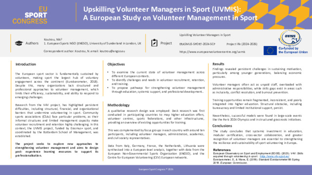 Koutrou, Niki (2025) Upskilling Volunteer Managers in Sport (UVMIS): A European Study on Volunteer Management in Sport. In: European Sport Congress, 04-05 Nov 2025, Lille, France.
