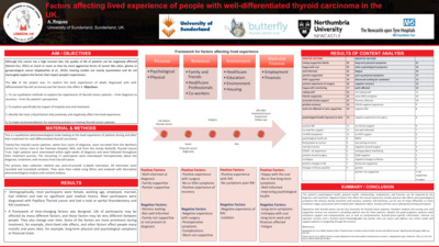 Rogusz, Alicja (2023) Factors affecting lived experience of people with well-differentiated thyroid carcinoma in the UK. In: World Congress of Thyroid Cancer, 16 Jun 2023, London. (Unpublished)