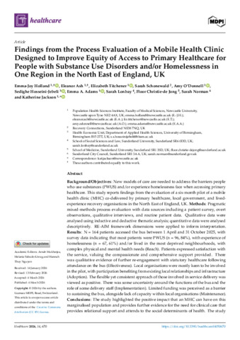 Holland, Emma-Joy, Ash, Eleanor, Titchener, Elizabeth, Schonewald, Sarah, O'Donnell, Amy, Hosseini-Jebeli, Sedighe, Adams, Emma A, Lonbay, Sarah, Christie-De Jong, Floor, Norman, Sarah and Jackson, Kat (2026) Findings from the Process Evaluation of a Mobile Health Clinic Designed to Improve Equity of Access to Primary Healthcare for People with Substance Use Disorders and/or Homelessness in One Region in the North East of England, UK. Healthcare, 14 (5). p. 670. ISSN 2227-9032
