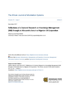 Okeke, Okeoma John-Paul (2018) Reflections of a doctoral research on knowledge management (KM) through an Afrocentric lens in a Nigerian Oil Corporation. The African Journal of Information Systems, 10 (1). 45- 53. ISSN 1936-0282