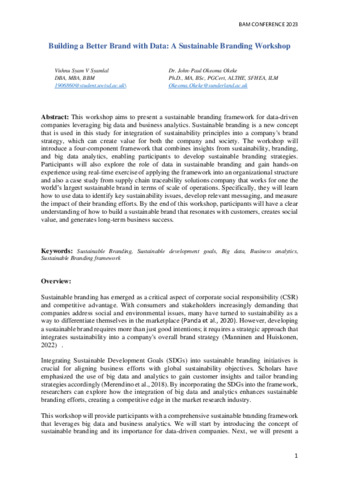 Syamlal, Vishnu Syam and Okeke, Okeoma John-Paul (2023) Building a Better Brand with Data: A Sustainable Branding Workshop. In: British Academy of Management BAM2003 Conference, 01-06 Sep 2023, University of Sussex Business School. (Unpublished)
