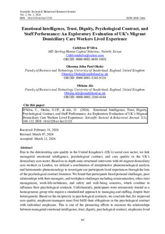 Emotional Intelligence, Trust, Dignity, Psychological Contract, and Staff Performance: An Exploratory Evaluation of UK’s Migrant Domiciliary Care Workers Lived Experience.