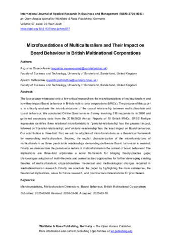 Osseo-Asare, Augustus E. and Pathirathne, Ayanthi (2026) Microfoundations of Multiculturalism and Their Impact on Board Behaviour in British Multinational Corporations. International Journal of Applied Research in Business and Management, 7 (3). pp. 1-29. ISSN 2700-8983