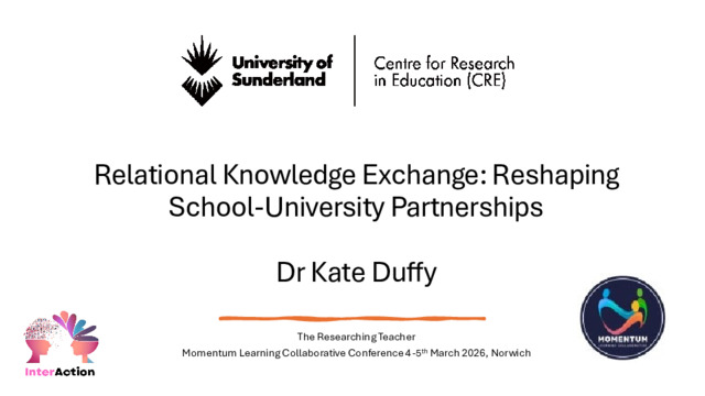 Duffy, Kate (2026) Relational Knowledge Exchange: Reshaping School-University Partnerships. In: Momentum Learning Collaborative Conference, 04-05 Mar 2026, Nowich, UK. (Unpublished)