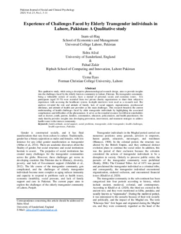 Ul Haq, Inam, Afzal, Sidra, Zakir, Fahad and Ilyas, Uzma (2025) Experience of Challenges Faced by Elderly Transgender individuals in Lahore, Pakistan: A Qualitative study. Pakistan Journal of Social and Clinical Psychology, 23 (1). pp. 3-11. ISSN 1727-4931